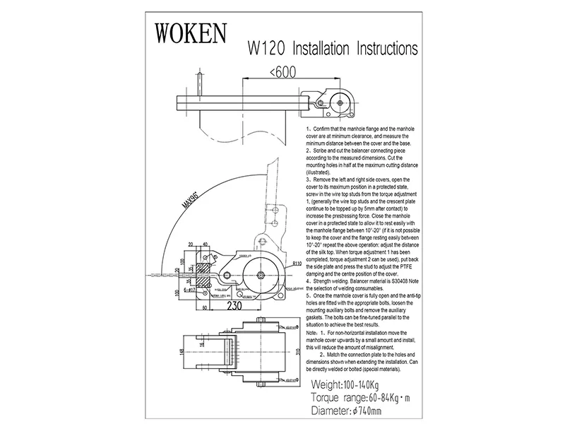 3、Remove the left and right side covers, open the cover to its maximum position in a protected state, screw in the wire top studs from the torque adjustment 1. (generally the wire top studs and the crescent plate continue to be topped up by 5mm after contact) to increase the prestressing force. Close the manhole cover in a protected state to allow it to rest easily with the manhole flange between 10°-20° (if it is not possible to keep the cover and the flange resting easily between 10°-20° repeat the above operation: adjust the distance of the silk top. When torque adjustment 1 has been completed, torque adjustment 2 can be used), put back the side plate and press the stud to adjust the PTFE damping and the centre position of the cover.